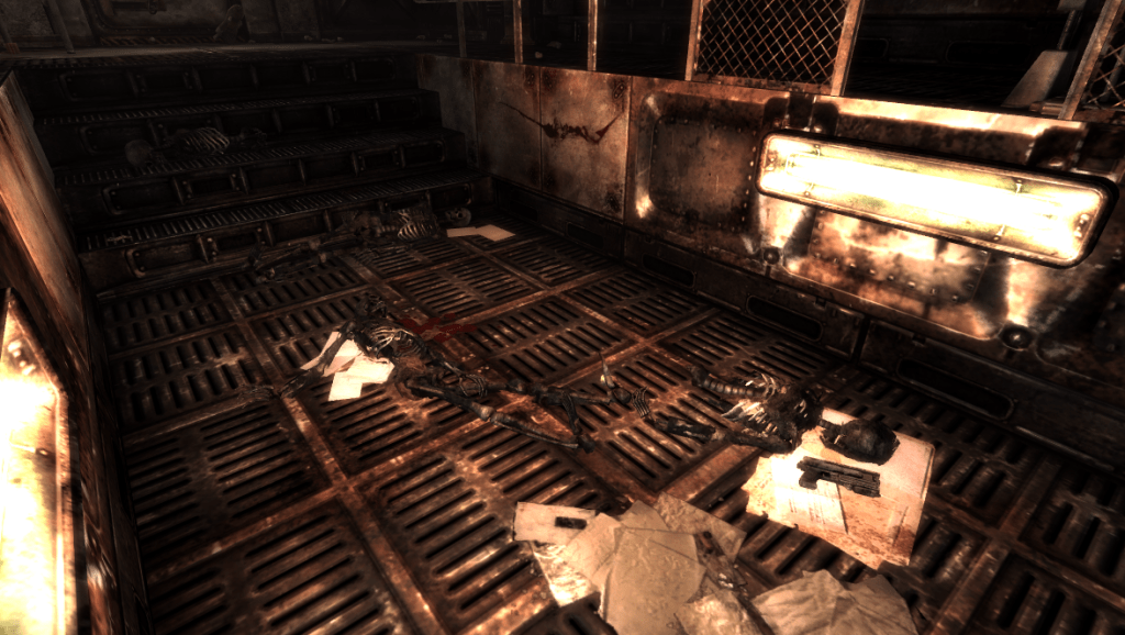 Yet that isn’t all. To collect the part that I had come to salvage, I had to go into the sacrificial chamber. In it, near the mainframe, were two recordings. The first was of the five survivors of violence in Vault 11, who finally refused to sacrifice one of their now-diminished population to the computer. The second recording was the computer’s automated response; it congratulated the survivors on their courage, then told them that the experiment was over and that the Vault door would now open. Those survivors then marched themselves to the entrance, and save one, killed themselves. The Vault and its ghosts then sat there, undisturbed, until my arrival.