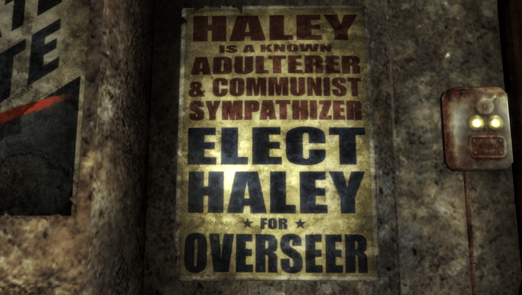 The story of Vault 11 turned out to be that of a society turned inside out. The relics I saw of this dead community suggested a total inversion of the social order that the survivors would have known, a case and point being the election poster below, which reads “Haley is a known adulterer and communist sympathizer. Elect Haley for overseer!” The abundance of such posters gave the impression of frequent and heated election contests in the Vault, wherein the individual deemed most detestable would be given ultimate authority.
