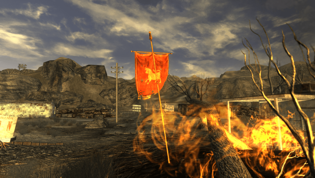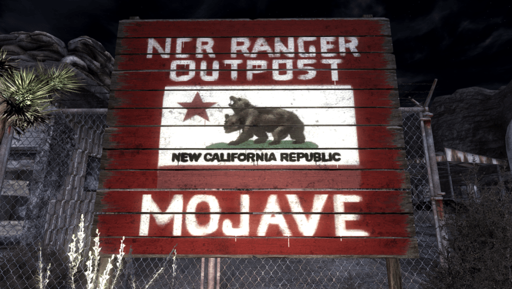 Fallout: New Vegas takes in the 2281 Mojave desert, 204 years after the world was devastated in a nuclear holocaust brought about by a war between two imperialist superpowers: the United States (US) and China. At the beginning of the game, the player character, who is simply known as “the Courier,” is shot, robbed of a package, and left for dead, all by a man known only as Benny. After being found and treated by a small-town doctor, the Courier must track down Benny alone, because beyond the townships, cults, and underground vaults that scatter the region, the Mojave has no overarching authority to appeal to. This constant state of anarchic brutality is how the Mojave has existed for over two hundred years, in a post-apocalyptic stasis, surviving only on the scraps of resources, technology, and traditions left behind by the Pre-War US. Yet the future is fast approaching as various factions engage in a conflict for control over the Mojave, and each needs the Courier and their package to triumph. One of these factions is Caesar’s Legion, a slave state structured around total warfare, while another is the New California Republic (NCR), a nation modeled on Pre-War US ideology.