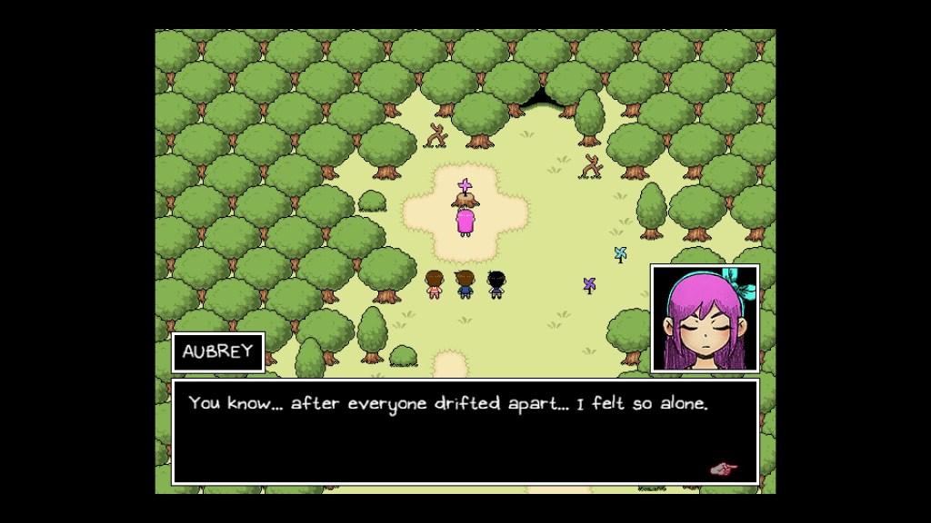 Rather than framing Sunny’s confession as the first step in a journey of accountability, and a journey of healing for his victims, OMORI emphasizes the fact that Sunny confesses in order to be forgiven. As PeppermintBee writes, the “ending headspace segments are focused on assuring Sunny that his friends will support/forgive him no matter what.” Sunny’s imaginary versions of his friends give him encouraging messages, the most telling of these messages coming from his co-conspirator Basil, who says that “Aubrey, Kel, and Hero are good friends. You have to trust that they’ll forgive us.” The game plays on the desire of its characters (and many of its players) to go back to the way things were before, and it presents Sunny’s confession as his attempt to do that. Yet that kind of presentation is deeply narcissistic; OMORI takes pains to explore the trauma of Sunny’s friends, trauma that he caused them on every level. Recall that Aubrey and Hero’s grief is presented as being worsened/prolonged by their belief that Mari took her own life, something that Sunny manipulated them into believing. Not only does Sunny owe his friends the truth, but his revelations could actually hold the key to helping them move on. While Sunny does provide the truth in the “good ending,” he does not do so out of concern for his friends, but rather out of concern for himself. Though OMORI tries to present this type of confession as, well, “good,” I was unable to find any sense of catharsis in this ending; I was drawn in by OMORI’s exploration of the darkly personal, but I was disturbed by its narcissistic conclusion.