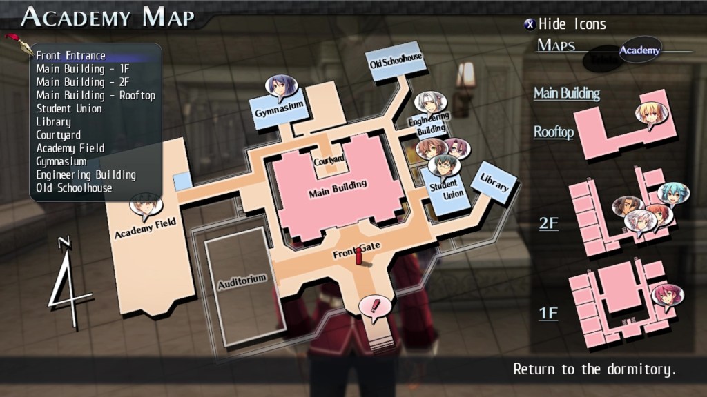 Each location Rean has access to stands in for a larger whole. Take his home base, Thors Military Academy. It’s one of dozens of specialized academies scattered across Erebonia; off the top of my head, I can recall characters discussing a finishing school for noble ladies, a musical academy, a political academy, and more. Rean never goes to any of those other schools and so the player never sees them, but I have no trouble believing they exist because of how detailed and immersive the developer Falcom made Thors. The Academy itself is detailed in terms of its buildings and such, but what’s more important is that nearly every student—even those outside of Rean’s inner circle—has a name and a role in the campus social structure. Becky, for example, is a student from the trading village of Celdic. She speaks with a Glaswegian accent in the English localization and a Kansai accent in the original Japanese. In each chapter, she comments on recent events from her perspective as a small-town girl from the boonies, develops her skills as an officer-in-training and aspiring merchant, and… well, that’s it! Becky has no direct impact on the plot, yet Falcom made her a complete character anyways. Thors is full of Beckys, little people who make this place they inhabit feel real. And because Thors is so believable, I started to believe in the other academies too, even though I never saw them. The other locations that Rean visits are similarly detailed. I immersed myself in a couple of cities and felt how they fit into a vast network of locales that stretches across Erebonia. It’s a model empire in that each small-scale location creates the illusion of a much larger whole; I spent almost entire days in Erebonia before realizing I still lived in our world and had an essay due the next day. But this illusion can only be stretched so far before it breaks. Just look…