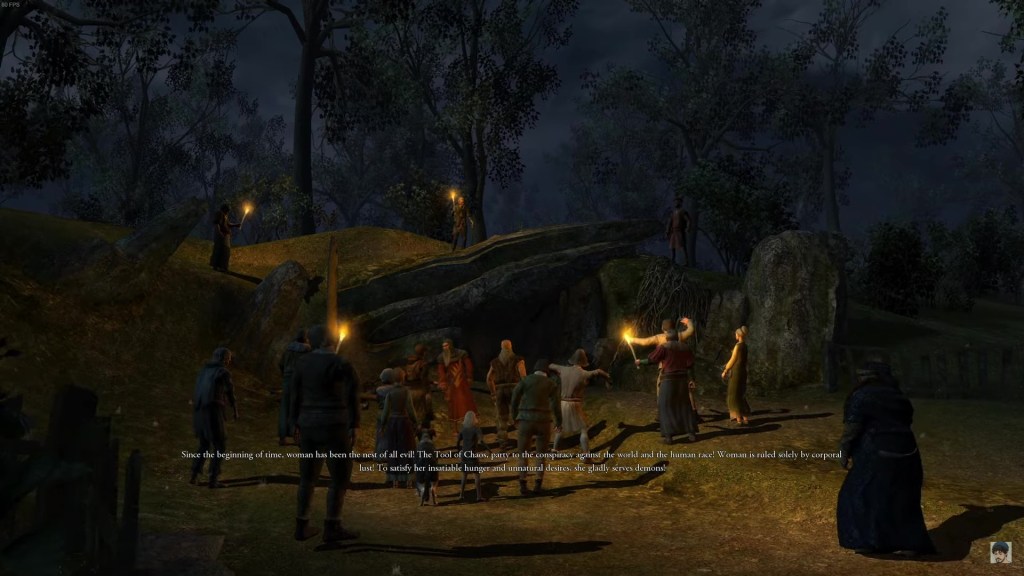 The massacre in the Vizima Outskirts is the most dramatic and interesting moment in TW1. Abigail, the local wise woman and healer, is accused of witchcraft by several prominent village elders. All these elders are men who have committed various misdeeds, and they accuse Abigail of inciting them to do so through sex and sorcery. Geralt has concluded his business in the Outskirts at this point, so he may choose to stay and defend Abigail or go on his merry way. It’s a brilliant little sequence that shows so much about the nature of this world, witch hunts, and Geralt’s uncertain place within it. Abigail is at the very least no more guilty than her accusers and may even be innocent; we wouldn’t know since she’s been given the impossible task of proving a negative. Yet if Geralt defends her, he has to cut through a frenzied mob of otherwise ordinary villagers. He would be destroying a whole community, an intolerant one though it may be, and what gives this contract monster-hunter the right to do that? For the record, I always defend Abigail. I don’t think one should suffer for the sins of the many, and I don’t think Geralt needs to be a knight to stand up to injustice. But that’s a question that Geralt grapples with all the time in the books, and whenever there’s a massacre involved, it haunts him. Not so in the games. No matter what Geralt chooses here, a massacre ensues, but he expresses no regret or doubt about his role in it. It’s almost as if he reloaded a save and saw that the story wouldn’t be much different if he took the other path. This self-assuredness is prominent within the later games as well.