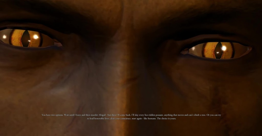 Since these narrative mechanics revolve around player input, players often respond negatively when they feel like a game is judging them for their choices—choices the game provided in the first place. That sort of judgement can be especially infuriating when it comes from the avatar, as that upends a whole boatload of rules that govern interactive game narratives. Rules like these: the player is the decider; the avatar follows the player’s instructions; the avatar is the player embodied in the gameworld. If Geralt doubts himself, he would also doubt the player and probably make them uncomfortable. If they’re going to play the Butcher of Blaviken, CDProjekt wanted them to feel good about it, something the first Witcher game made clear right off the bat.